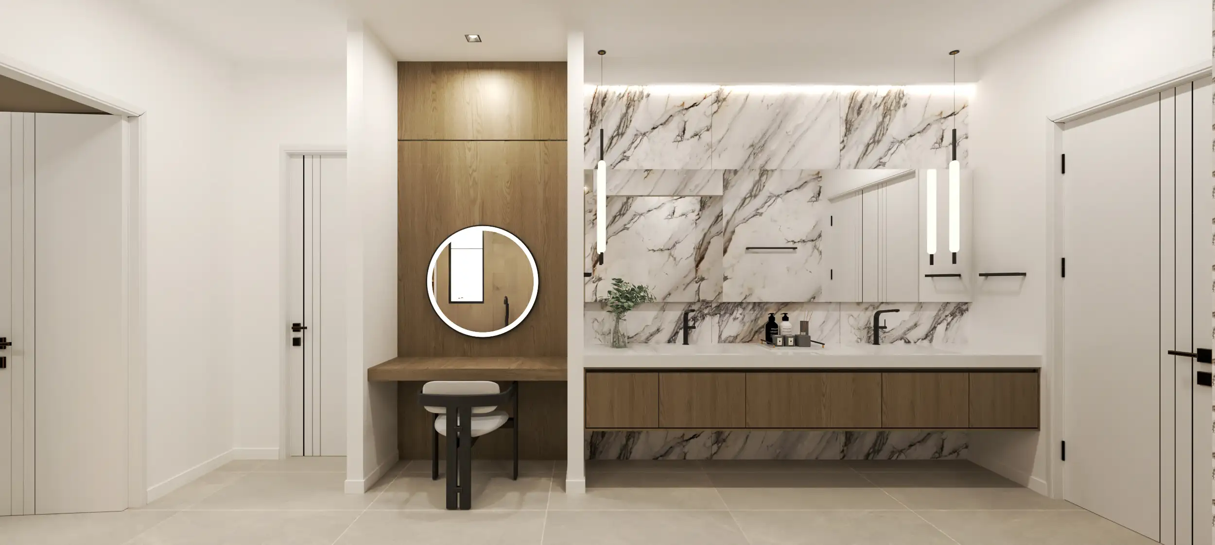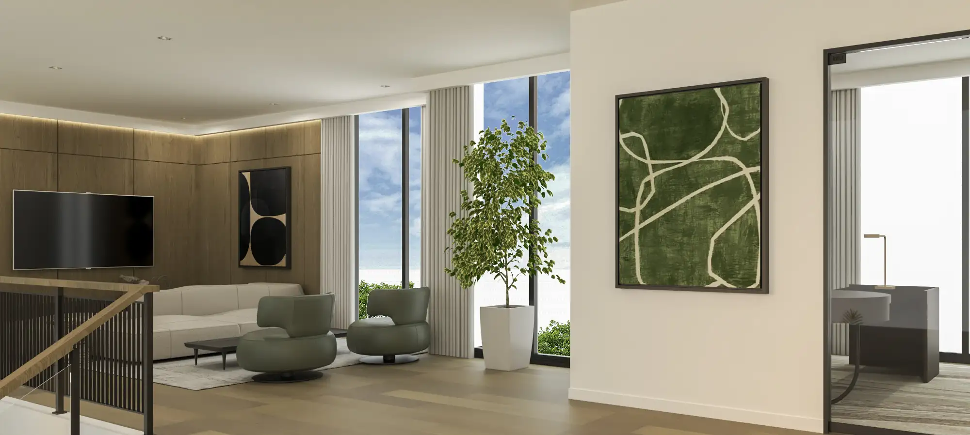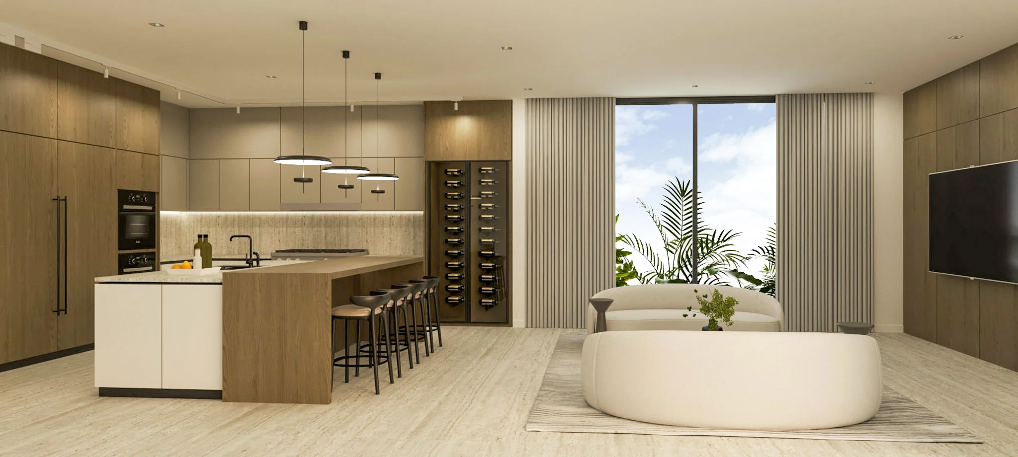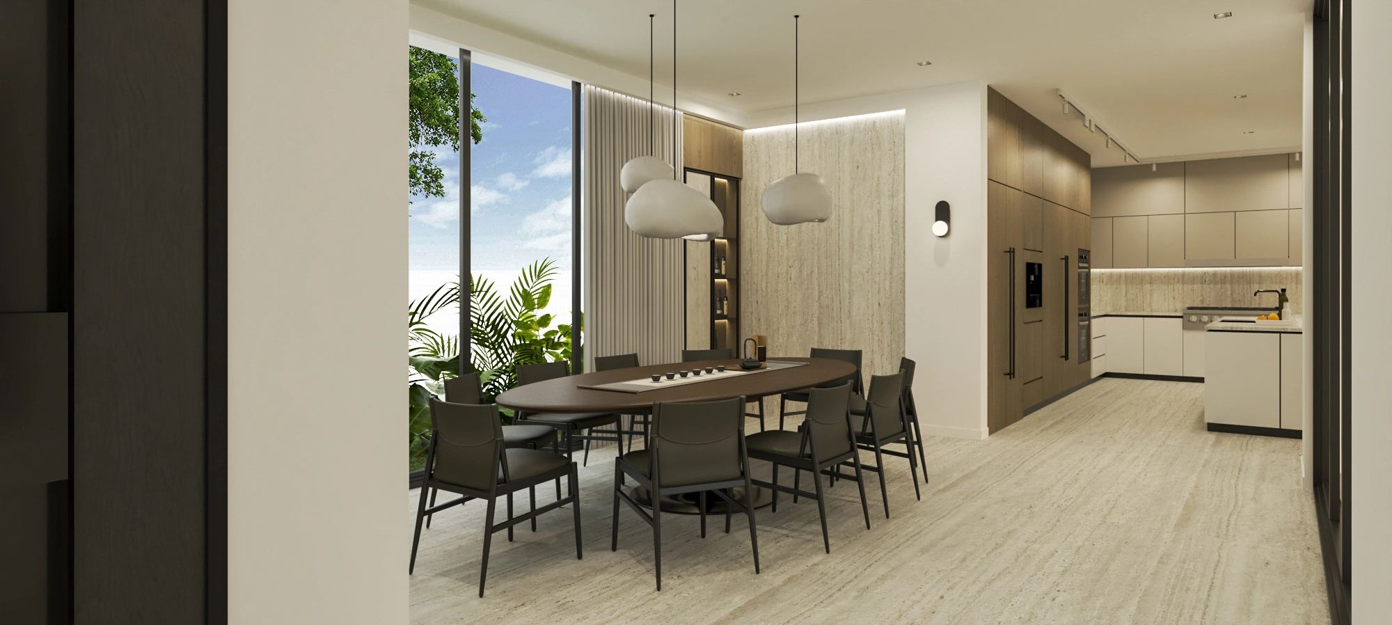 This open concept kitchen seamlessly blends style and functionality. Comes equipped with top of the line Miele appliances, and custom European cabinetry. The layout promotes both efficiency and social interaction, making it perfect for both everyday cooking and entertaining guests.